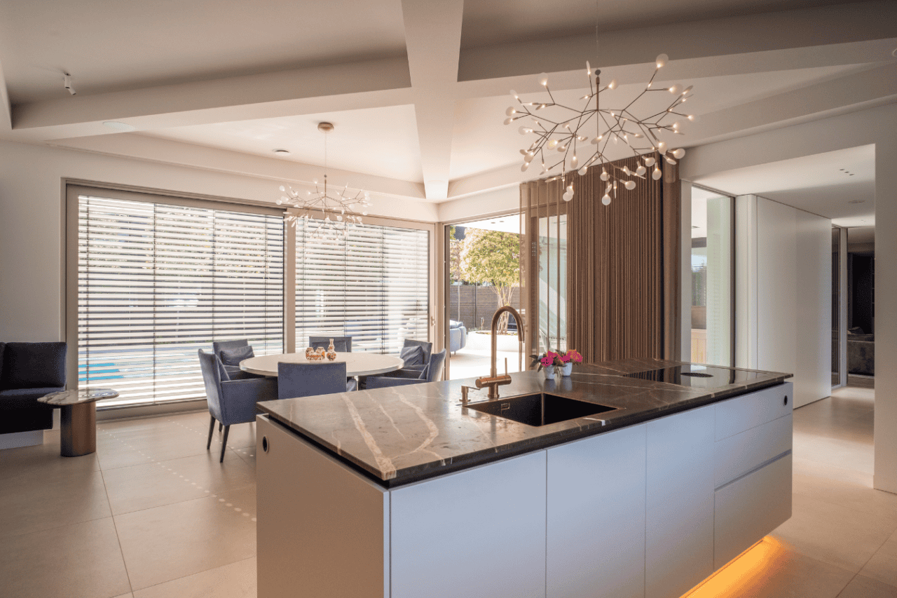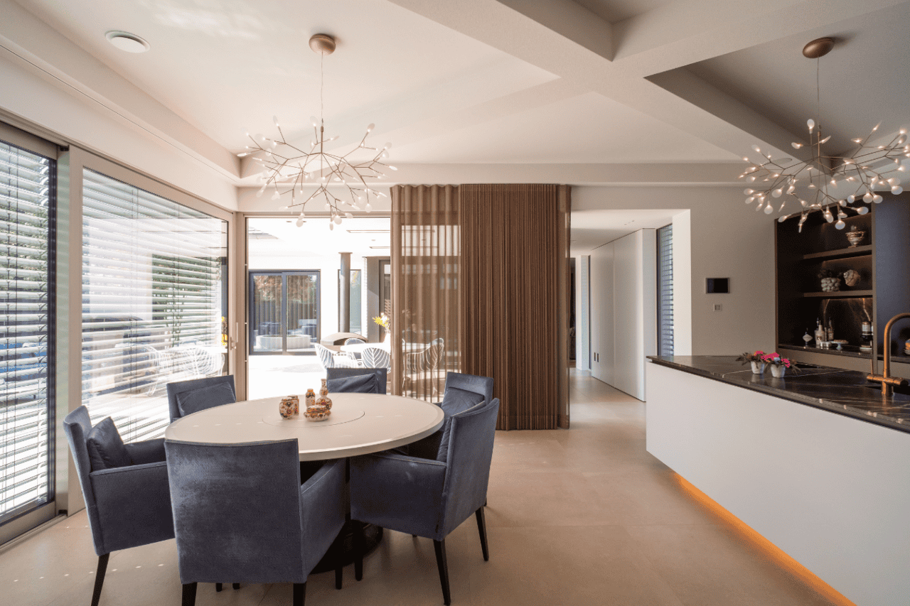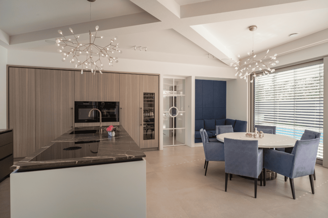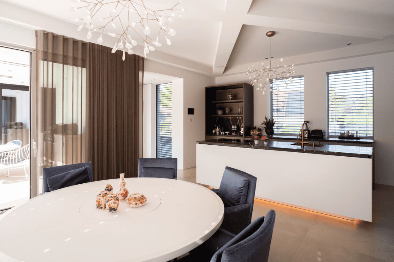 In een stijlvol ingerichte residentie hebben we een akoestisch plafond geïntroduceerd dat de kern van huiselijk comfort raakt. De keuken, vaak het kloppend hart van het huis, en de aangrenzende eettafel zijn getransformeerd door de installatie van een akoestisch plafond dat opgaat in de architectuur. Dit biedt een dubbele luxe: een visuele naadloosheid die de zintuigen streelt en een geluidservaring die rust brengt in het centrum van dagelijkse activiteit.