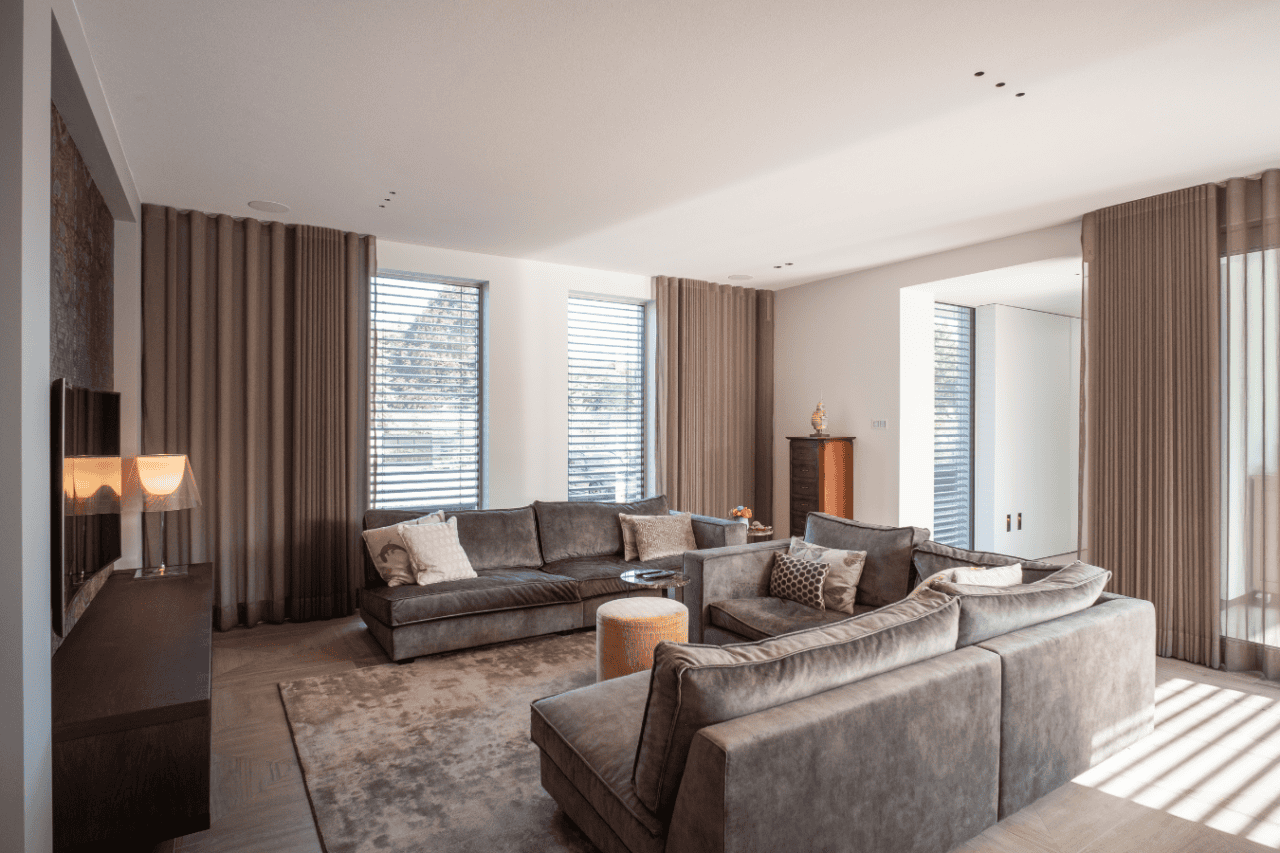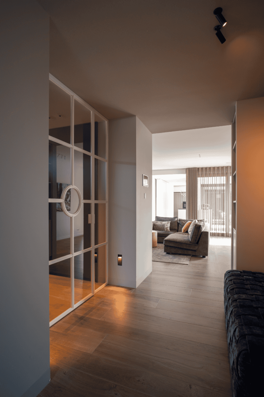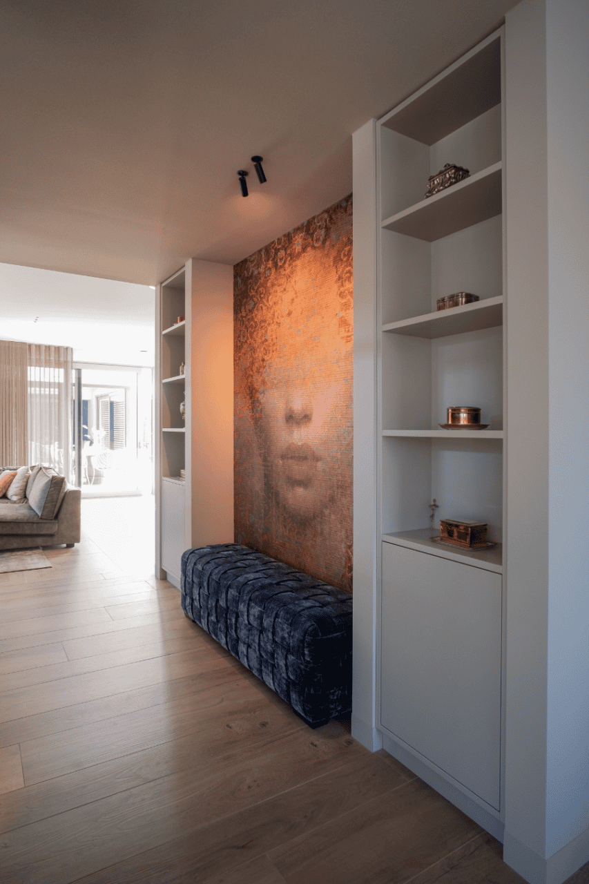 Voortzettend in de woonkamer, verlengt het akoestische plafond zijn functionele elegantie en biedt het kalmte. Het design integreert naadloos met het interieur, terwijl het de geluidskwaliteit verhoogt, het gesprek verrijkt en de luisterervaring zuivert. Door de toepassing van een naadloos akoestisch plafond is de ambiance van elke bijeenkomst of ontspannen avond verfijnd. Dit project weerspiegelt een verbintenis aan zowel akoestische perfectie als esthetische integriteit, waarmee de woonruimte zich onderscheidt als een toonbeeld van modern wooncomfort.