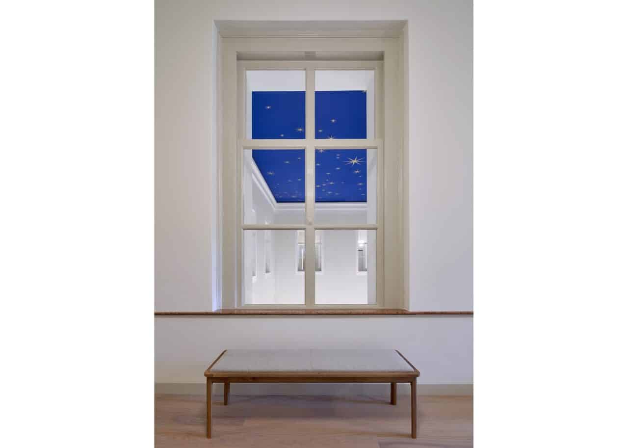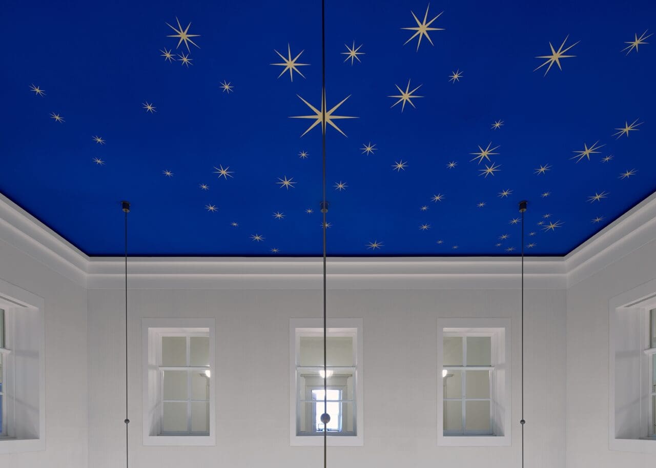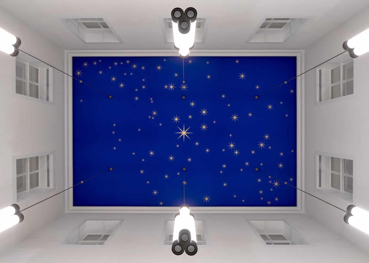 In de foto is een blauwe sterrenhemel te zien dat volledig akoestisch is afgewerkt. De ruimte heeft een oppervlakte van 50m² en is ruim 10 meter hoog. Dat veroorzaakt de nodige galm en echo's, waardoor bezoekers overlast zouden ervaren van geluidshinder. Door over het complete oppervlakte akoestiek toe te passen is het akoestisch probleem aangepakt bij de kern.