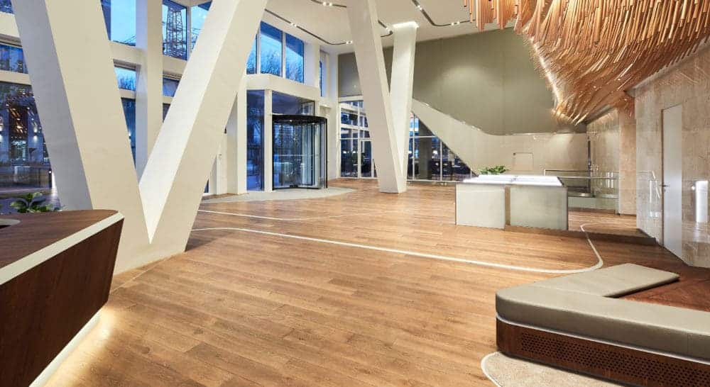 Pennings Akoestisch Afbouwen heeft een uniek plafond weten te realiseren. De steunpalen vallen weg in het plafond dat wordt verlicht met een led strip en de lichtlijnen golven mee met het plafond. Het is een bijzonder dynamisch plafond met een uitstekende akoestiek. De lobby van het kantoor is weer akoestisch comfortabel.