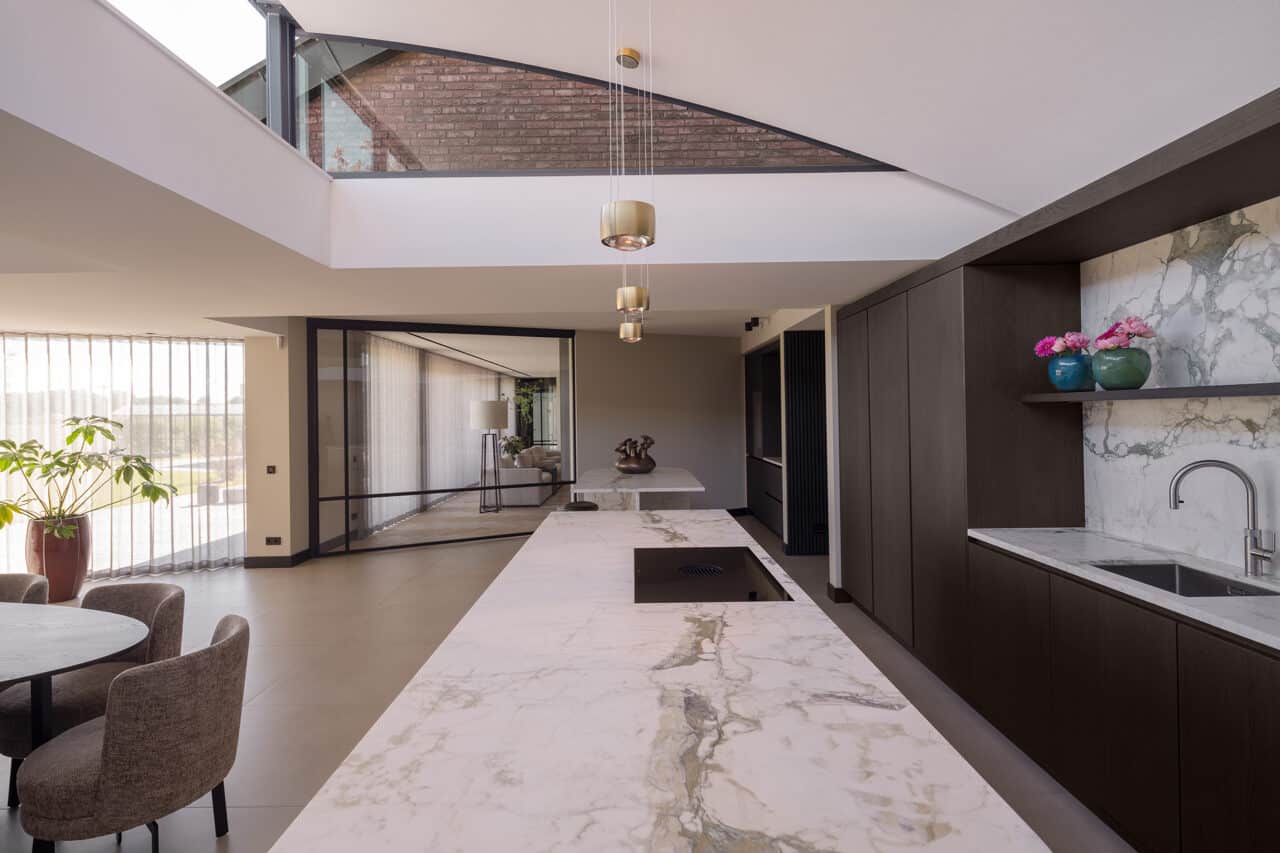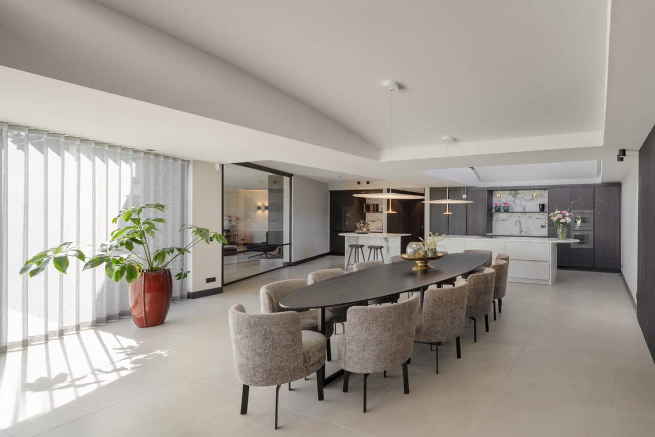 De ruimtes in deze woning hebben een groot oppervlakte, waardoor de bewoners onaangename galm zouden ervaren. Door het naadloos akoestisch plafond wordt weerkaatsing van het geluid geminimaliseerd. Dit resulteert in sereniteit en wooncomfort voor de bewoners.