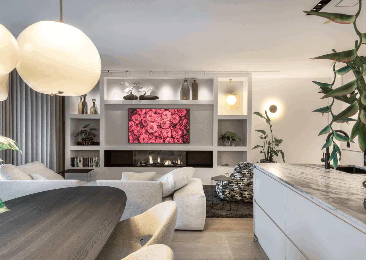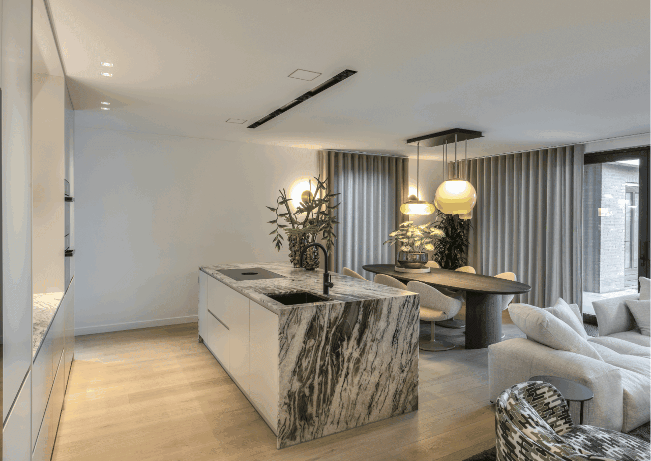 De oplossing? Een naadloos akoestisch plafond. dat perfect aansluit bij de warme, huiselijke uitstraling van het interieur. Het plafond is volledig afgestemd op de nieuwe woonfunctie en zorgt voor een stille, serene sfeer in elke ruimte.